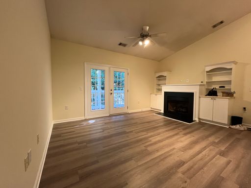 Step inside to an inviting open-concept living area with high ceilings and French doors that fill the space with natural light and open onto a private back deck — ideal for relaxing or entertaining. Elegant built-in bookcases frame the cozy fireplace, adding charm and functionality.